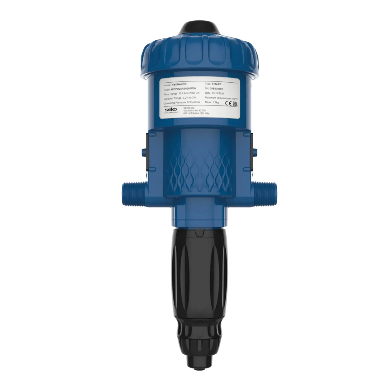 L’HYDRAKOS D25RE viene installato direttamente nella linea di alimentazione idrica, la pompa Seko WDP funziona utilizzando il flusso dell’acqua come fonte di energia. L’acqua attiva la pompa, che preleva la percentuale di concentrato richiesta direttamente dal contenitore e la inietta nell’acqua. All’interno della pompa, il prodotto viene miscelato con l’acqua e la pressione dell’acqua spinge la soluzione nell’a tubazione a valle.